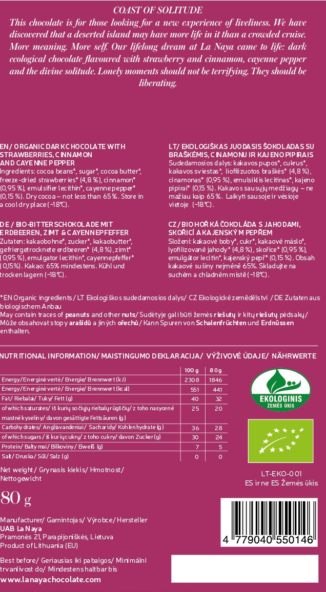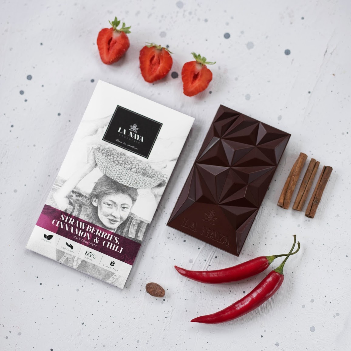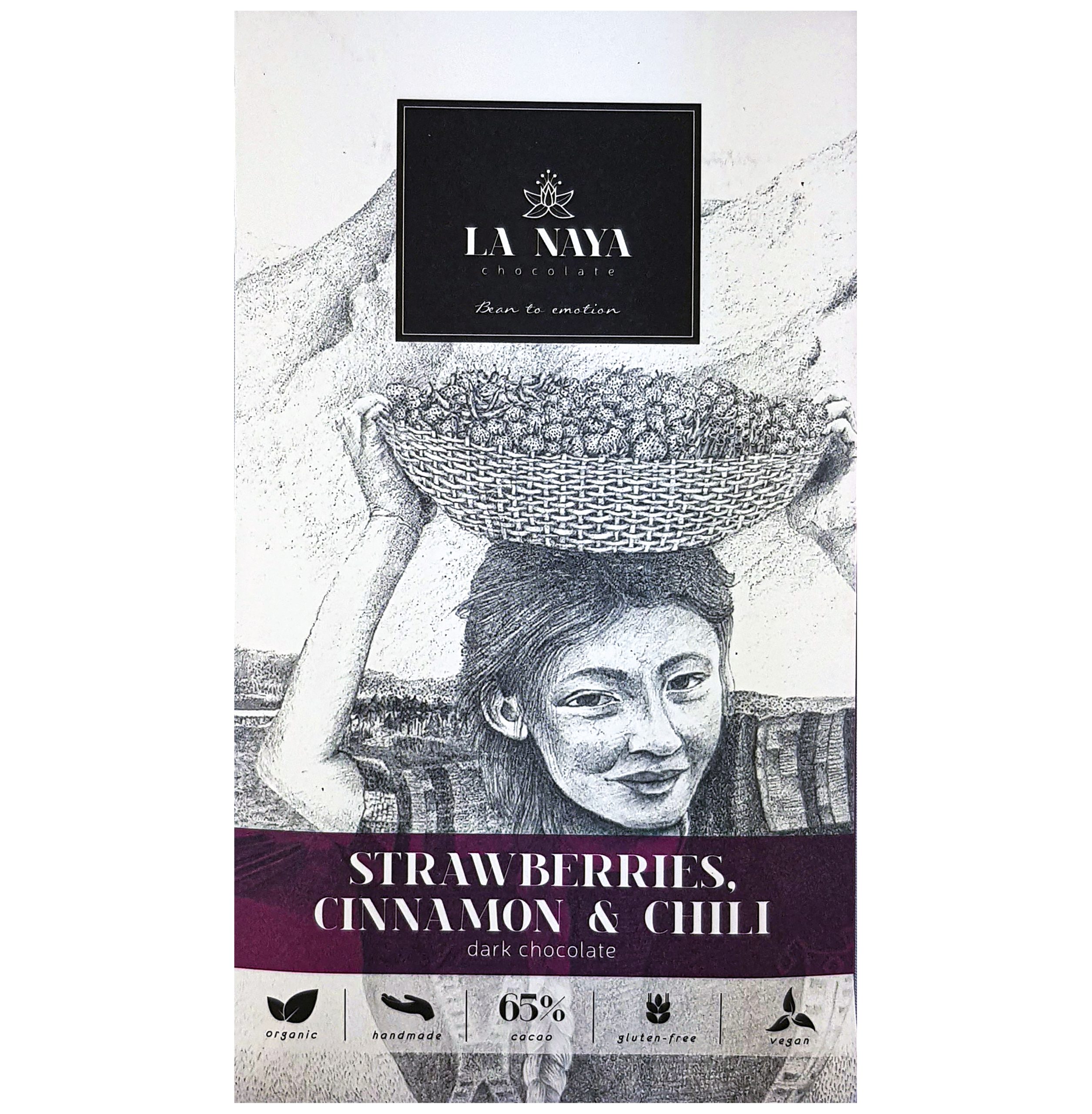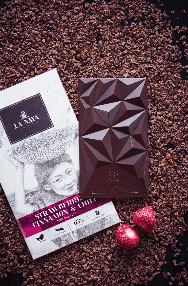 Juodasis Bean-to-Bar šokoladas su braškėmis, cinamonu ir kajeno pipirais