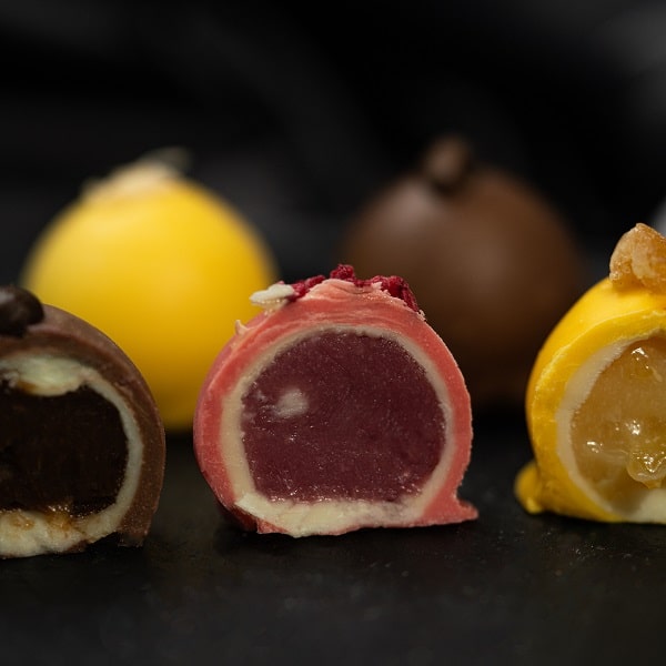 Šokoladiniai saldainiai su natūraliais vaisių ir uogų įdarais