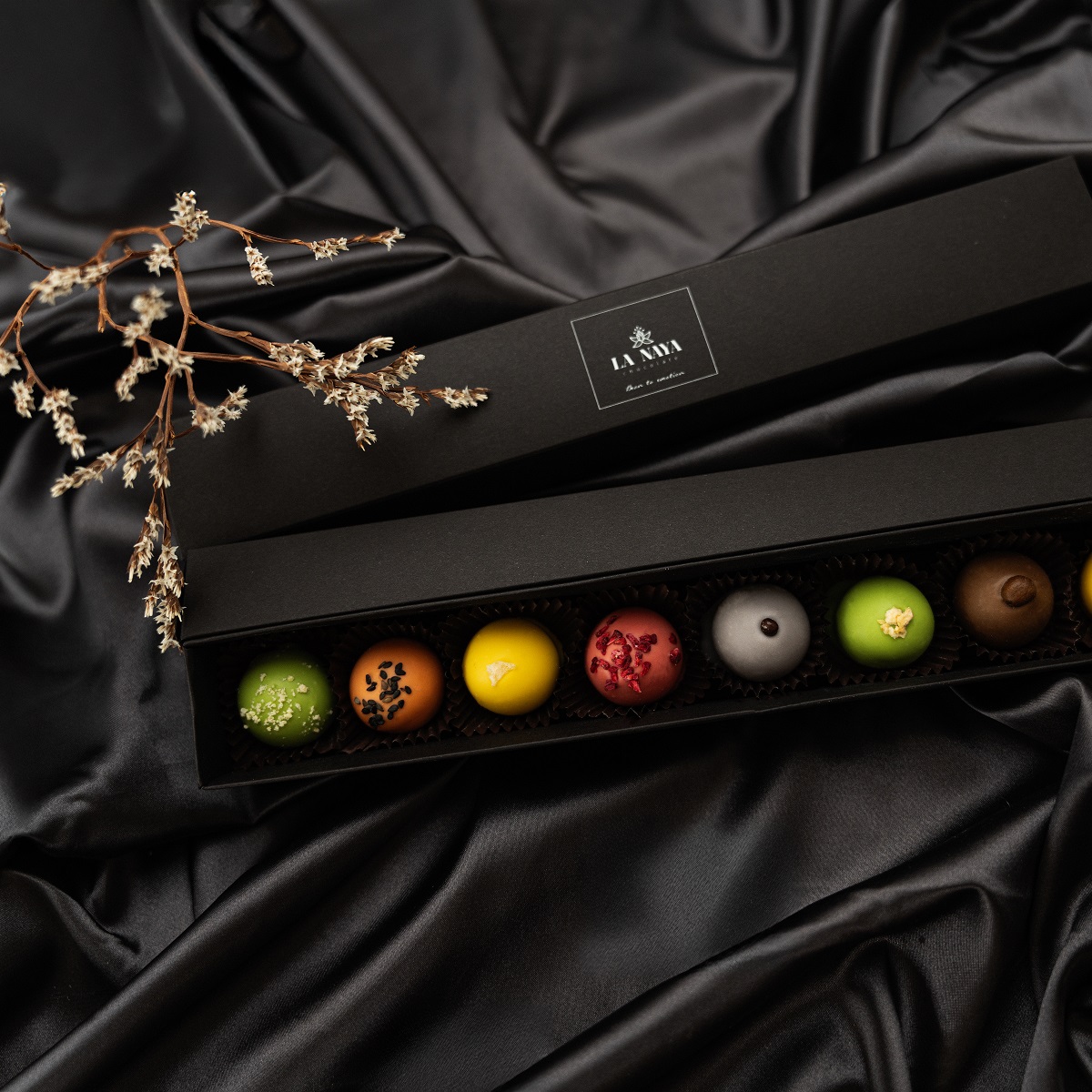 LA NAYA šokoladiniai saldainiai su natūraliais įdarais – tai valgoma dovana, kupina spalvų, tekstūrų ir skonių. Ananasų gaiva, aviečių rūgštelė, pistacijų švelnumas ir mėlynių saldumas – kiekvienas kąsnis atskleidžia naują šokolado dovanų istoriją.
